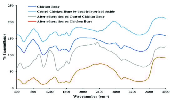 The vibrations of both metal-O and O-metal-O are usually associated with the peak closest to 553 cm−1 [39]. In comparison with the coated adsorbent, it was noted that sorbent had a shifted peak at 1348 cm−1. This shift in the peak occurred as a result of the in-plane vibration band of the CO32− and the stretch absorption band that indicates the successful enhancement of the coated adsorbent. Additionally, Figure 1 depicts the new peaks for the chicken bone/LDH and sorption chicken bone/LDH specimens, which appeared to be strengthening at 557, 1447, 1664, and 3425 cm−1. After the impregnation of Mg-Fe layered double hydroxides (Mg-Fe LDH), the -OH stretching peak strengthened, but after the sorption of Cd2+, it was significantly weakened. These peaks considerably altered with the occurrence of the black shift afterwards the saturation of Mg-Fe LDH and the adsorption of Cd2+, which proved that Cd2+ sorption was significantly influenced by the coating hydroxides.
