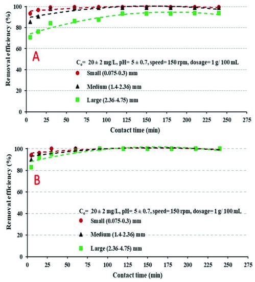 Influence of contact time on the ability of both coated and uncoated chicken bone particles to remove Cd2+ ions from water was explored by adding 1 g of each adsorbent into a 250 mL flask containing 100 mL of Cd2+ solution. Coarse (2.360–4.750 mm), medium (1.400–2.360 mm), and fine (0.075–0.3 mm) particles of each adsorbent were used in these experiments. Figure 3 depicts the removal of Cd2+ by both coated and uncoated chicken bone particles. It can be observed that two phases were involved in the metal sorption: the rapid sorption phase that involves passive surface reactions, such as chemical complexations (reaction between Cd2+ ions and anion hydroxides forming the metal-ligand complex), or electrostatic sorption onto the surface of adsorbents [34,40]. In this rapid phase, a considerable rise in Cd2+ removal was observed with the increase of contract time. This rapid phase was followed by a decrease in the removal of Cd2+. The decline in sorption could be related to the reduction in the availability of vacant sorption sites on the surfaces of coated or uncoated adsorbents. The outcomes of the experiments indicated that minimizing the particle size of the adsorbents was beneficial for Cd2+ removal; it was observed that the fine particles of both coated and uncoated particles provided better and faster removal of CD+2 ions. The explanation for this enhancement in Cd2+ removal is the increase in the surface area of the particles (number of sorption sites) with the decrease in the particle sizes. Additionally, equilibrium status was attained after 60 min using the coated chicken bone particles, but 120 min were needed to attain equilibrium status using the uncoated chicken bone particles. Generally, the best removal of Cd2+ using the coated adsorbents was 98%, which was reached after 60 min; using uncoated adsorbents it was 93%, which was reached after 120 min.