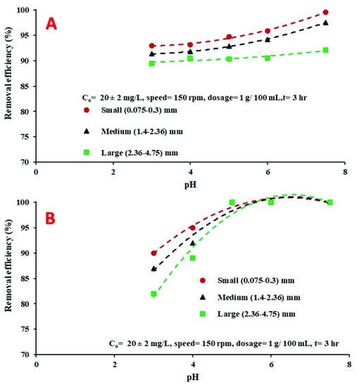 Variation of Cd2+ removal with the initial pH using: (A) Uncoated chicken bone particles, and (B) coated chicken bone particles.