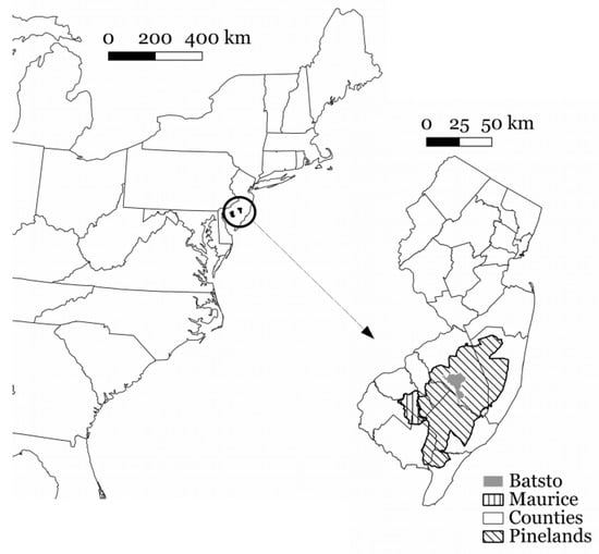 - Walker, R.L.; Nicholson, R.S.; Storck, D.A. Hydrologic Assessment of Three Drainage Basins in the Pinelands of Southern New Jersey, 2004-06; Technical Report 2011-5056; U.S. Geological Survey Scientific Investigations: Reston, VA, USA, 2011; 145p. [Google Scholar]