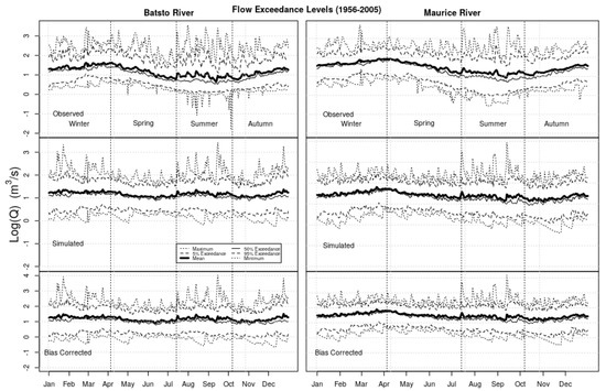 where is the observed data, is the inverse CDF for , and is the CDF for . The CDF was the quantile function estimated from the data that used a quantile step of 0.01. Bias correction was applied for daily mean flows over the full period 1956–2005 based on the composite FDC. As with uncorrected simulations, performance for bias-corrected simulations was evaluated using GoF measures.
