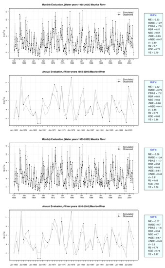 Goodness-of-fit (GoF) measures are the traditional way to assess the performance of hydrologic models. Moriasi et al. [43] suggested that for watershed models, GoF measures for daily, monthly, or annual simulations should have values of , , and . Evaluation of model performances using these metrics suggested that the model in the Batsto River performed adequately on daily mean, monthly mean, annual mean, and (most) seasonal mean flows, but only monthly mean flows were adequately simulated in the Maurice River. Ritter and Munoz-Carpena [44] suggested that an acceptable model would have an , in which case only annual flow simulations in the Batsto River and annual and monthly mean flows in the Maurice River would be considered adequate. The use of the coefficient of variation () and other correlation measures for model calibration and evaluation has been questioned [45], but it was included here primarily for model comparison. Additionally, several variants of the were used to supplement this efficiency measure. The Kling–Gupta efficiency improves on the NSE because it includes more information on model performance including correlations, bias, and variability [36,46]. The index of agreement d provides a measure of differences in the means for observed and simulated flows and does not include a correlation measure, though the measure is sensitive to the influence of extreme values due to the use of squared differences [45]. The Volumetric Efficiency () represents the fraction of water delivered at the proper time and in itself provides some measure of the skill of the model to capture an important aspect of the flow regime. Including these GoF measures for models in both basins indicated that PRMS simulations over the time period 1956–2005, compared with the shorter evaluation period (1997–2003) from Daraio [18], performed as well or better for some measures and worse on others. Overall, this increased the confidence in model performance for both basins.