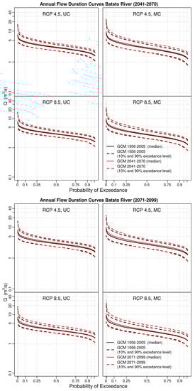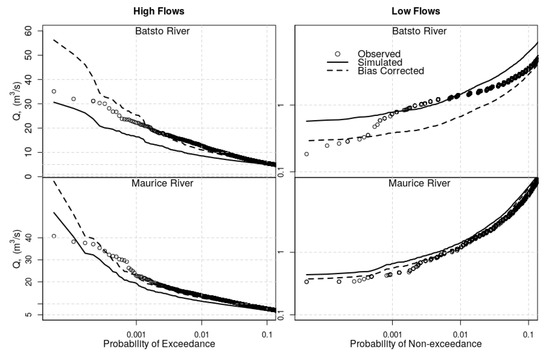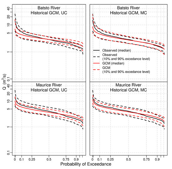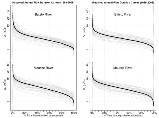 Annual and full record FDCs for observed, simulated, and GCM-driven derived stream flows were analyzed using the R package “hydroTSM” [36]. GCM-driven simulations were analyzed for each individual GCM, but results were pooled for simulations with multiple runs (CanESM, 5 runs; CCSM4, 2; CSIRO-Mk3.6.0, 10; IPSL-CMA5-LR, 4; MIROC5, 3, MPI-ESM-LR, 3; MPI-ESM-MR, 3). Flow duration curves from the time slices 2041–2070 and 2071–2099 were developed, and stream flow projections were corrected for model error (model corrected) using quantile mapping with the R package “qmap” [35]. Simulations were model corrected using pooled parameter estimates for GCMs with multiple runs.