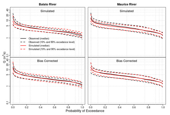 The variations in observed annual FDCs (Figure 6) were relatively well represented by uncorrected simulated flow duration curves in both basins. Differences in uncorrected simulated flow bias for each basin were more apparent when comparing the annual FDCs and the 10% and 90% FDCs. For instance, the consistent underestimation of high flows and underestimation of low flows was clearer in Batsto. The middle of the FDC () was well represented by uncorrected simulations, as well as the variance in annual FDCs. In Maurice, for , the tendency of uncorrected simulations to underestimate flows can be seen clearly. Uncorrected simulations in Maurice also showed slightly lower variation than observed flows in the annual FDCs.