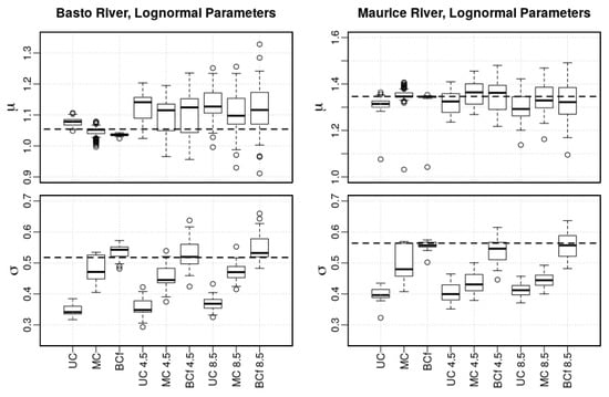 Hydrologic simulations driven by GCM data could only be evaluated using FDCs. Estimated parameters for the fitted lognormal distributions for uncorrected and model-corrected simulations driven by GCM data showed greater variation than parameters bias corrected directly with observed data (Figure 8). GCM-driven simulated stream flows showed relatively low overall variation for estimated parameters over the historical period and increased variation in parameters for climate change projections, which indicated over-correction of stream flows. It is likely that bias correction of GCM-driven stream flow simulations with observed flow data, in this case, reduced the simulation of the natural variation of the hydrologic model. Therefore, the analysis of climate change impacts on flow duration curves was done using only model-corrected GCM simulated stream flows.