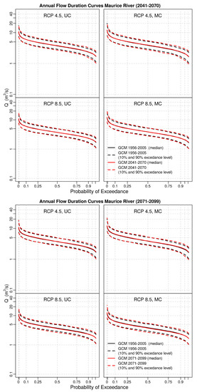 The upper Maurice basin is much more developed, and urbanization is expected to continue in the future as the population continues to increase. The climate change projections do not include potential changes to land use and the expected growth of urban area in the basin; therefore, the results must be interpreted in light of this limitation. For instance, the potential increase in high flows due to climate change is likely to be exacerbated by increased urbanization. Additionally, projected decreases in low flows have potential implications for water resources in Maurice since they signify a reduction in base-flow and thus groundwater recharge, and the majority of drinking water is obtained from groundwater sources in the watershed [18]. However, knowing the potential changes due to climate change can help water resource managers and engineers adapt water infrastructure systems and control that which is amenable to such control. The use of FDCs to show these potential changes could be a strong means to convey the impacts of climate change on water resources and guide such decisions.