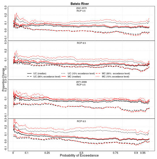Changes in FDCs were analyzed qualitatively by plotting the projected median FDC, 10% exceedance FDC, and 90% exceedance FDC curves and baseline FDC curves at the same exceedances. Quantitative estimates of the proportional change (percent change expressed as a decimal) were obtained using GCM-driven simulations for the historical period as a baseline. Changes in stream flows from the projected median FDC, 10% exceedance FDC, and 90% exceedance FDC curves were estimated using: