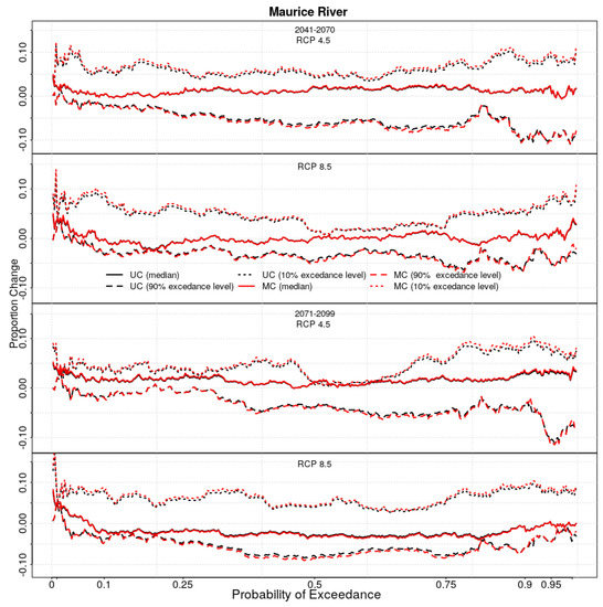 For the Maurice River, there was little or no difference between uncorrected and model-corrected simulations of projected stream flows (Figure 13). Under RCP 4.5 for both time slices, the change in median FDCs indicated that flows were not projected to increase by more than around 2.5% at most , with slightly greater increases in flow indicated at . Under RCP 8.5, projections for 2041–2070 indicated that median flows will not change except at the extremes, and . Projections also indicated an increase of 5–10% in the 10% FDC for and suggesting that higher low flows and greater high flows may occur in the future. Projections in FDCs for 2071–2099 under RCP 8.5 showed a decrease in the median FDC in Maurice for all , but with an increase in flows with and extreme high flows could increase by . Furthermore, projections suggested that flows ranging from could decrease slightly.