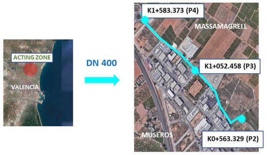 The network studied is located between the municipalities of Museros and Massamagrell, in the province of Valencia (Spain). It is a cast iron pipeline with a nominal diameter DN400. The length of the installation is very large, more than 3 km long, but this study analyses a specific section that is 1020 m long, in which the emptying manoeuvre was performed. The section studied spans from the abscissa K0 + 563.329 (point P2) to K1 + 583.373 (point P4).