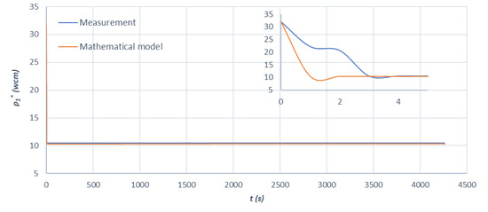 During the first 3 s of the transient, the pressure suddenly varies and changes from the initial pressure inside the pipe to a pressure close to atmospheric pressure. After these first seconds, the pressure remains practically constant (very close to atmospheric pressure) throughout the entire emptying process. It is observed how the pressure obtained by the experimental measurement takes 2 s more to stabilize and to reach the value of atmospheric pressure than the same value of the mathematical model.
