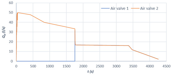 Evolution over time of the airflow entering the two air valves during the emptying process in section P2–P4.