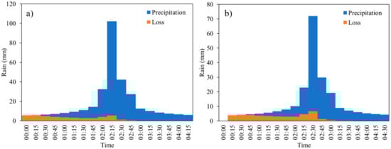The net rainfall was evaluated with the well-known SCS-CN method [60], considering an average Curve Number of 86 for the sub-basin and adopting the initial loss as the 20% of the maximum infiltration losses. The basin Runoff Curve Number was determined for soil in average moisture conditions. Figure 2 shows the net hyetographs for the two adopted return periods.