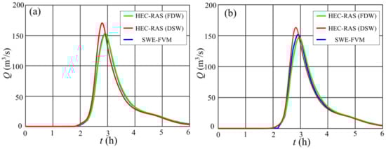 Discharge hydrograph simulated with HEC-RAS and SWE-FVM models for a return period of 200 years: element size 5 m (a) and 10 m (b).