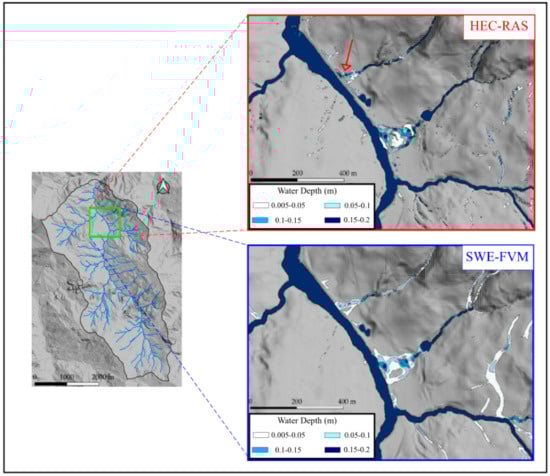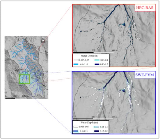 - The flooded area related to the first threshold (0.05 m) is underestimated in respect to the SWE-FVM one. In particular, the part of the network having lower Horton-Strahler order is described by HEC-RAS as disconnected, while HEC-RAS and the SWE-FVM models describe the main channel in a similar way;