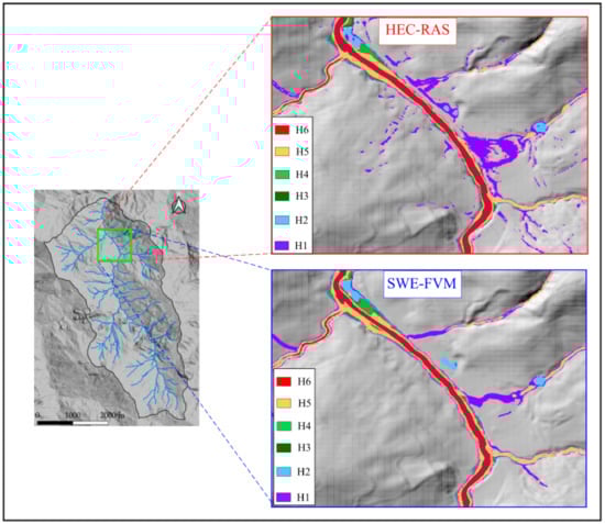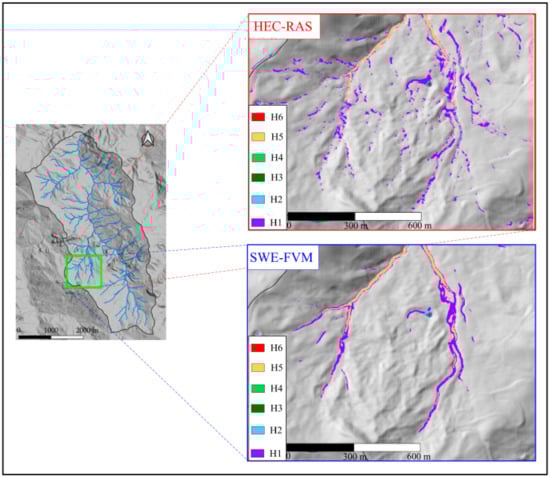 Figure 10 and Figure 11 show the comparison between the hazard maps computed by the two models in the two selected areas discussed in Figure 7 and Figure 8. While in the river network the hazard classes computed by the two models seem to be close together, it is interesting to note that HEC-RAS defines zones far from the network in H1 and H2 classes. In these areas, water depths are smaller than the selected threshold (0.05 m), meaning that very high velocities are found.