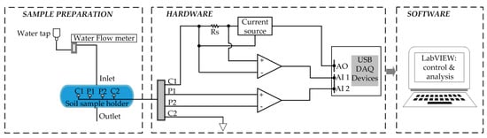 Figure 1 shows the schematic diagram of the experimental setup, which consists of a columnar sample holder, electronic hardware, and software. A soil sample holder made of a PVC pipe has an inner diameter of 5 cm and a length of 20 cm. A commercially available soil (decomposed granite soil) with a particle size from 1 µm to 2 mm was used as a test soil sample. Four stainless steel screws of 3 mm in diameter were set horizontally at 2.5 cm intervals as current electrodes (C1, C2) and potential electrodes (P1, P2), and their contact length with soil was about 4 mm. The conventional four-electrode configuration (Wenner array) was used, as shown in Figure 1. Due to this electrode configuration, calculated values using voltage and current show merely apparent impedance, and consequently, soil properties such as resistivity are not given. Water used in the experiment was groundwater, which was supplied from a water tap, regulated by a flow meter and vertically fed into the sample holder through the inlet and outlet ports. Water contained ions and minerals such as Ca2+, Mg2+, Na+, K+, SO42−, Cl−, NO3−, and SiO2, and its conductivity was about 21.5 mS/m.