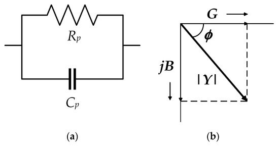 Figure 2a shows an RC parallel equivalent circuit model of soil used for calculation of the apparent impedance. Admittance and impedance are expressed by Equation (1) with parallel resistance and capacitance , and angular frequency of the applied current.