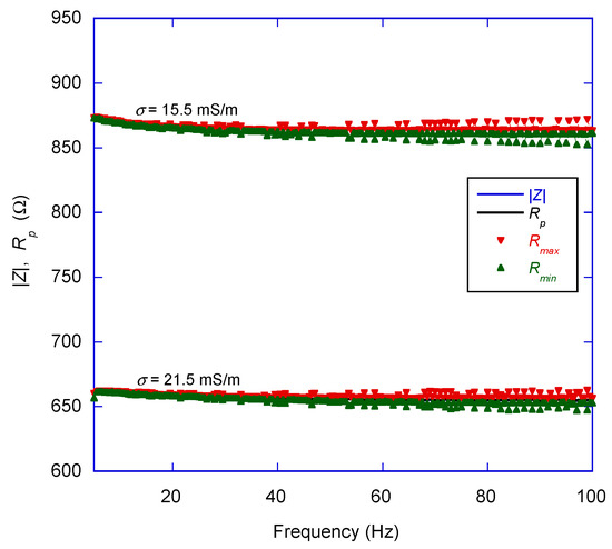 Apparent impedance of water was measured by filling the sample holder with water only. Figure 3 shows the apparent impedance and resistance of water as a function of frequency. Data measured using water of lower conductivity (15.5 mS/m) is also shown in this figure. The impedance was almost the same as resistance, which means the apparent capacitance of water filled in the sample holder was small. The resistance slightly decreased at a lower frequency, and then it kept the almost constant value of 656 Ω until 100 Hz. The fluctuation of resistance, which is seen in Figure 3 as the difference between and , was small, since the sample holder was filled with only still water, which had uniform properties.