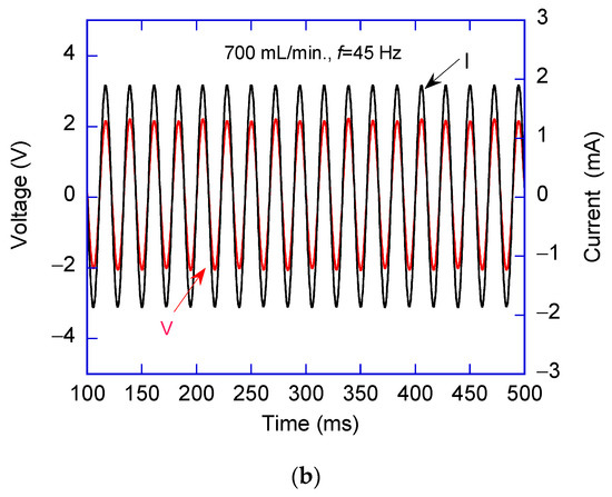 Figure 4a,b shows the applied sinusoidal current waveforms (black lines) to the soil sample, which had a constant amplitude of 1.8 mA and frequency of 45 Hz. In these figures, the observed voltage waveforms (red lines) between potential electrodes (P1, P2) are also shown. Figure 4a shows the waveforms without water flow, and Figure 4b shows those with water flow at a rate of 700 mL/min. These waveforms were in steady-state at 100 ms after the current was applied. The voltage waveform without water flow showed a constant amplitude of about 2.5 V, while the waveform under water flow showed the smaller amplitude of 2.2 V with faint cycle-by-cycle fluctuations. The influences of both a water flow rate and a measurement frequency on the fluctuation frequency were observed. It was found that the apparent impedance of soil was affected by water flow.