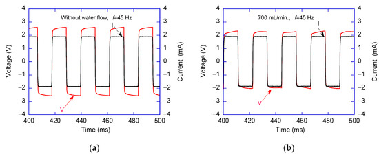 Figure 5a,b shows the waveforms under the same conditions except for applying a square waveform current. As seen in Figure 5a, without water flow, almost the same voltage waveforms were repeated in each cycle; on the other hand, as seen in Figure 5b, these were modulated by water flow. In real-time monitoring of the waveforms, it was observed that the frequency of modulation varied with a water flow rate.