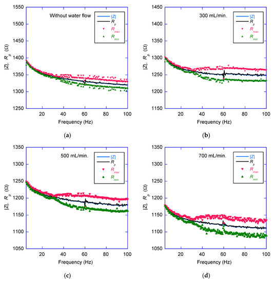 Apparent soil impedance , resistance and max. and min. of : (a) without water flow; (b) water flow of 300 mL/min; (c) water flow of 500 mL/min; (d) water flow of 700 mL/min.