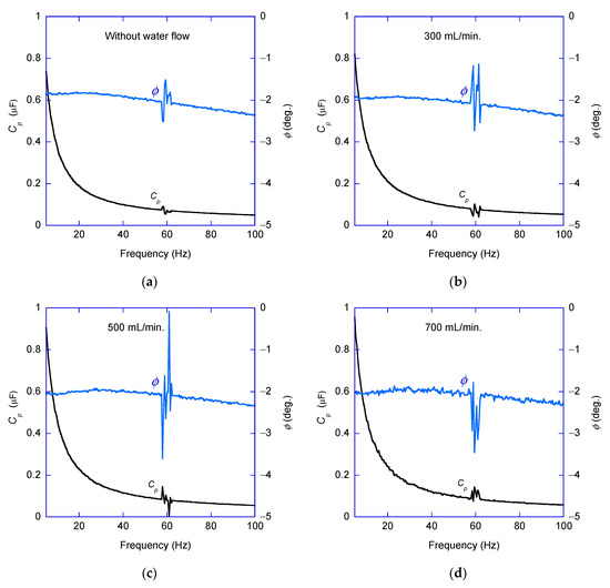 Figure 7a–d shows apparent soil capacitance and phase difference between voltage and current in the cases of (a) without water flow and (b)–(d) with water flow rates of 300 mL/min, 500 mL/min, and 700 mL/min, respectively. The capacitance had large values at a lower frequency due to interfacial polarization and decreased with the increase of the frequency in all cases. Without water flow, phase decreased monotonically with frequency. With water flow, the phase fluctuated slightly, and its large oscillation at around 60 Hz seems due to induction by the power line. Since phase was calculated under the assumption that these waveforms had a constant frequency and amplitude, the phase calculation became sensitive to interference induced by the power line.