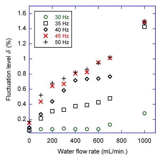 Figure 8 shows the relationship between the fluctuation level δ and a water flow rate at five different frequencies from 30 Hz to 50 Hz. The fluctuation levels were proportional to a water flow rate, and they increased with frequency until about 45 Hz at all flow rates except 1000 mL/min. The fluctuation level may have been affected by the electrokinetic effect that resulted from water flow in soil. On the other hand, the fluctuation levels at 30 Hz were small for all water flow rates, and they are also seen in Figure 6b–d.