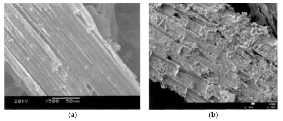 The SEM images of BC and ZnBC are shown in Figure 1. The dark zones and light zones, are each referred to carbon structure and metal oxides [26]. As shown, BC had an ordered structure, contained porous morphology and some small particles on its surface [26]. After the modification by ZnCl2, the original structure was broken, several metal oxides appeared on the carbon sheet. As a consequence, the surface area was increased compared to BC carbon.