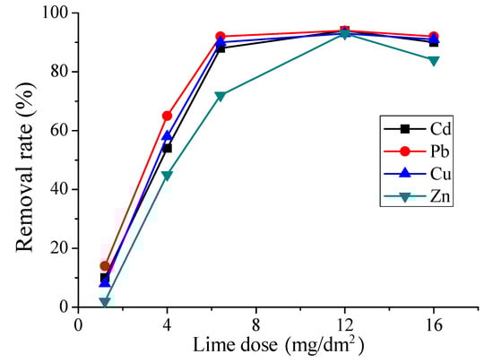 The influence of lime dosage on the heavy metal removal rates is shown in Figure 2. Since FeCl3 is a weakly alkaline salt, it could generate a large number of H+ in the washing solution. When Ca (OH)2 was put into the wastewater, OH− would neutralize the free H+ in the water firstly. After that, the pH of the waste would increase along with the addition of Ca (OH)2. The solution pH had a significant effect on the solubility of heavy metals. According to the research of [35], the hydroxide of metals would not be formed until the solution pH reached the “adsorption edge.” Generally, the pH of the solution controls the degree of dissociation of acidic or basic compounds. When the pH reaches a specific range, these compounds will dissociate and thereby affect the adsorption of them. Makino et al. (2016) [11] found that the solubility product constant (Ksp) of Cd, Pb, Cu, and Zn were 2.8 × 10−14, 1.1 × 10−20, 1.9 × 10−20, and 4 × 10−17, respectively. The maximum removal rates of Cd, Pb, Cu, and Zn could exceed 99% when the pH was around 7, and the concentrations of Cd, Pb, Cu, and Zn in solution could reduce to 0.08, 0.018, 0.15, 0.44 mg/dm3, respectively.