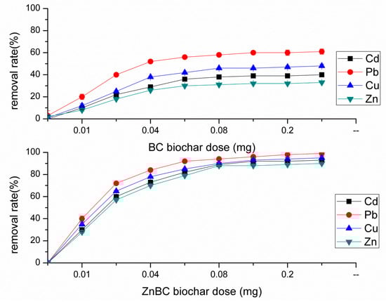 Removal rates of heavy metals by BC and ZnBC in waste soil washing effluent were shown in Figure 3. After soil washing, the pH of the waste effluent was 2.41. ZnBC had better effects on the absorption of Cd, Pb, Cu, and Zn than BC. The removal rate of Cd, Pb, Cu, and Zn when treated with BC were 40.01%, 61.23%, 48.56%, and 33.27%, respectively. Compared with BC, Zn BC had much better adsorption capacity of metal ions in the wastewater, and the removal rates of Cd, Pb, Cu, and Zn were 93.18%, 99.23%, 95.44%, and 90.67%, respectively. According to previous research [36,37], sorption of the metal ion by BC is mainly influenced by BC surface chemistry and its surface area or by precipitation reactions. Therefore, pyrolytic temperature [38], surface chemistry [39] modification, and the solution pH [40] would exert a significant impact on the adsorption performance of BC. For example, some BCs had the maximum adsorption of metal ions when the solution pH value was around 5 [40,41,42]. In consequence, the high specific surface area of ZnBC was probably an important reason for its higher removal capacity, compared to BC. According to Section 3.1, the BET surface area of ZnBC is thirteen times larger than BC, which means there would be more adsorption sites available for the adsorption of heavy metals [43,44]. On the other side, the main existing form of Zn was Zn-OH on the surface of ZnBC after ZnCl2 activated [24]. As a consequence, ions exchange could happen between Zn-OH and metal ions (Cd, Pb, and Cu). The ionic radius of Cd, Pb, Cu, and Zn were 0.97, 1.21, 0.70, and 0.74 nm [45], respectively; the average pore diameter of BC and ZnBC were 2.60 and 2.57 nm. So, the metal ions could fill in the micropores of both BCs. Therefore, ZnCl2 modified BC possessed the practical value for removing metal ions in the waste washing effluent.