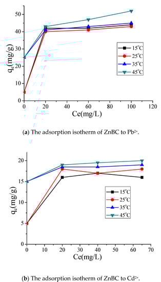 The equilibrium adsorption quantity qe of ZnBC adsorbing Cd2+ and Pb2+ with the equilibrium concentration Ce in the solution after adsorption equilibrium was plotted; the adsorption isotherms of ZnBC adsorbing Cd2+ and Pb2+ at different temperatures were obtained, as shown in Figure 4. Under the experimental conditions, when the equilibrium concentration was lower, the specific adsorption capacity of ZnBC for Cd2+ and Pb2+ increased sharply with the increase in the solution concentration, showing that the adsorbent had high adsorption capacity even at low concentrations. The specific adsorption capacity of the adsorbent for Cd2+ and Pb2+ generally increased with the increase in temperature, indicating that heating was beneficial to adsorption. Generally, increasing the temperature will increase the diffusion rate of adsorbate molecules in the outer boundary layer of the adsorbent. Second, temperature changes may affect the equilibrium adsorption capacity of the adsorbent. Figure 4 illustrated that the amount of adsorption increased with an increase in temperature. This change indicated that the reaction was endothermic.