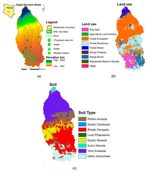 The SWAT model inputs were: Digital Elevation Model (DEM), soil map, land use map, and weather data. The SWAT 2012 ArcGIS interface [45] was used to discretize the River Thiba’s watershed, which was delineated from a 30 m Digital Elevation Model [46]. For the delineated watershed, the soil types and the land use of the study area were extracted from global databases of the Food and Agriculture Organization (FAO) [47] and Globcover [48] respectively, due to limited data availability in the study area. River discharge data and daily weather data were collected from the Kenya Water Resources Management Authority and the Kenya Meteorological Department, respectively. The local weather stations, Castle Forest, the Mwea Irrigation Agricultural Development Centre (MIAD) and Embu, are shown in Figure 3a as numbers 1, 2 and 6, respectively. The weir intakes on the River Nyamindi and the River Thiba are shown in Figure 3a as numbers 4 and 5, respectively. The proposed Thiba Dam location is shown as number 7. Due to data gaps and limited discharge measurements at the weir intakes, the River Gauging Station (RGS) 4DD02 (shown as number 7 in Figure 3a) was selected as the watershed outlet. The study area measures 1545 km2. The Digital Elevation Model, land use and soil maps are as shown in Figure 3. The delineation of the catchment study areas was done automatically in SWAT and stream networks were generated based on topography, flow direction and flow accumulation, discretizing 20 sub basins. The soil and land use maps were imported into SWAT and overlaid onto the DEM and the catchment was further subdivided into 351 spatial units known as Hydrologic Response Units (HRUs). Climate data was then imported into SWAT and once all the relevant input had been entered, the model was run.