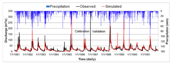 SWAT simulation was done from 1979 to 2015 using observed historical data, with a two year warm-up period. The model was calibrated and validated for the periods 1981–1986 and 1987–1991, respectively using SWAT calibration and uncertainty programing [49]. After running the model, the simulated stream flow was evaluated using the Nash–Sutcliffe Efficiency (NSE) and percent bias (PBIAS) [50]. NSE is a normalized statistic that describes the relative magnitude of the residual variance as compared to the observed variance and demonstrates how well the plot of observed versus simulated fits the 1:1 line. PBIAS measures the average tendency of the simulated data to be larger or smaller than the observed counterparts [51]. After the simulation, determination of the rate of change in model output with respect to changes in input/parameters (sensitivity analysis) was done using the Sequential Uncertainty Fitting (SUFI-2) algorithm [52,53].