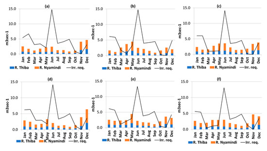 Under RCP 2.6, the highest total available flow was observed in the months of May, November and December; and the least in the month of February for both the 2020–2060 and the 2061–2099 periods (Figure 8a,b,d,e). The highest irrigation water requirements were observed to be the highest in the months of June (14.7 m3 s−1 under GCM 1 and 2 in 2020–2060) and the least in the month of November (0.2 m3 s−1 under GCM 1) as shown in Figure 8c,e.