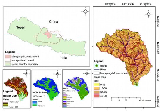 The study has been conducted in the Marsyangdi-2 River catchment (Figure 1), Nepal. It is located between 2810′21″ N to 2854′11″ N and 8347′24″ E to 8448′04″ E. The catchment has a total area of 3001 sq. km, of which 80% lies above the elevation of 3000 m asl. The catchment elevation ranges from 641 m asl to 7924 m asl with a mean elevation of 4377 m asl, and mean slope of 29.34. Marsyangdi-2 river is a tributary of the Narayani river catchment (Figure 1). It originates from the southern edge of the Tibetan Plateau, flows through Nepal to India, and drains into the Ganges River. Approximately 24% of area is covered by glaciers [35]. The hydrological regime is heavily influenced by seasonal weather variations. The seasons are defined as monsoon (June to September), post-monsoon (October to November), winter (December to February), and pre-monsoon (March to May) [36]. Approximately 80% of the total annual precipitation occurs during the monsoon period [37,38].