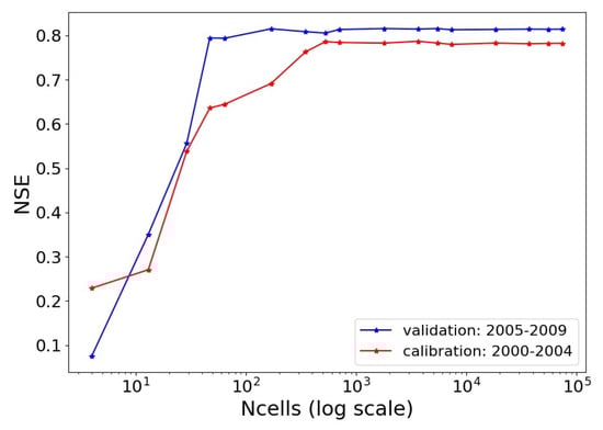 In the study, TINs with different numbers of cells were generated with the help of Rasputin and DEM [56]. The generated TINs with different number of cells are used for the model calibration and validation. The Nash–Sutcliffe Efficiency (NSE; see Section 2.4.1) value was used for evaluating the performance of the models with particular numbers of TIN cells. Implementing the spatially distributed parameters for the TIN with different number of cells yielded different simulation performance when compared to the observations over the calibration (2000–2004) and validation (2005–2009) periods. As expected, model efficiency in terms of NSE increased with increasing number of TINs (Figure 2). However, after reaching a certain number of cells no further improvement in NSE was found, indicating the limit for Shyft to utilize terrain data. The number of cells corresponding to this limit was considered as an optimum i.e., 671 cells (with median area of 4 km ) (see Figure 2).
