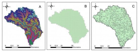 Catchment discretization by (A) hypsographic, (B) regular space grid, and (C) TIN methods.