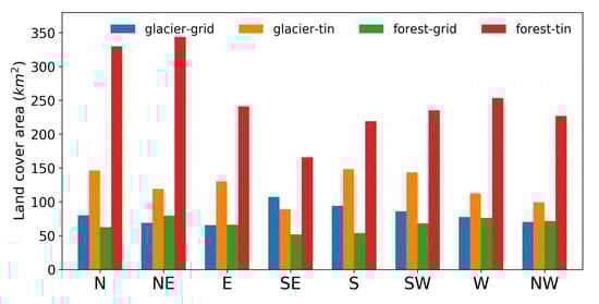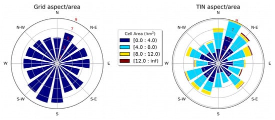 Remarkable differences are observed in grid/TIN area distributions with respect to aspect. In regular space square grid, a higher percentage of area is facing towards southwest direction, while in TIN a higher percentage of area is facing towards northeast direction (Figure 5). Differences in area distribution with respect to aspect in different discretization methods ultimately result in differences in snow/glacier cover area in the catchment.