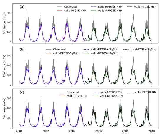 Observed and simulated discharge from different models under the two radiation models i.e., PTGSK and RPTGSK for the discretizations, i.e., hypsography (a), square grid (b), and traingulated irregular network (c). In the figures legends, “Calib” and “valid” represent model calibration and validation, respectively.