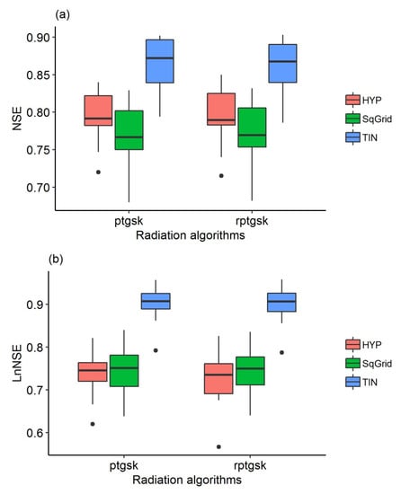 Effect of the catchment discretization methods and radiation algorithms on model performance was further evaluated using NSE and LnNSE (Figure 7). The NSE and the LnNSE functions are a pair of conflicting objective functions, where the NSE function evaluates the ability to reproduce all stream flows, but it is known to be biased to predict peak flows [23], while the LnNSE function emphasizes low flows [62]. The model efficiency metrics were computed for each hydrologic year constituting the validation period. As such, each factor had 10 samples with a total size of 60 samples (two radiation algorithms and three discretization types). For model efficiency under high-flow condition as estimated using the raw-data (NSE) (Figure 7a), a more significant difference in model efficiency was observed between the catchment discretization types as compared to the radiation algorithms. The intercomparison between discretized models shows that TIN was superior to both the square grid cells (SqGrid) and the elevation bands (i.e., HYP), while HYP has yielded better result as compared to SqGrid. A similar order of performance between the three catchment discretization types was observed under the two radiation algorithms. Although a slight improvement was observed in SqGrid as a result of using RPTGSK against PTGSK, a slight deterioration in model performance was observed when using HYP and TIN with RPTGSK. A superior result was also obtained in model performance during low-flow conditions (LnNSE) when using TIN as compared to other catchment discretization types (Figure 7b). Unlike to the result obtained using NSE, a relatively better simulation result was obtained under SqGrid than HYP when assessed using LnNSE. No significant difference in LnNSE was also observed between the results obtained from PTGSK and RPTGSK.