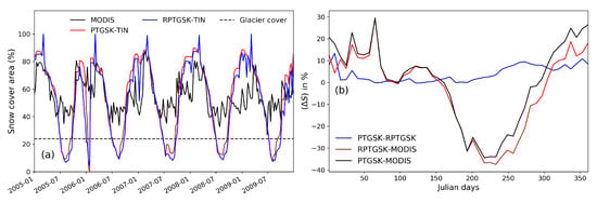(a) Catchment scale 8-day maximum snow cover area (%) from MODIS, PTGSK-TIN, and RPTGSK-TIN. (b) Snow cover area percentage differences between PTGSK-TIN and RPTGSK-TIN (blue), RPTGSK-TIN and MODIS (red), and PTGSK-TIN and MODIS (black).
