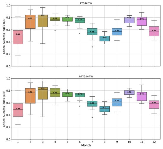 Monthly Critical Success Index calculated for models (PTGSK-TIN, and RPTGSK-TIN). Numbers inside boxplot represent median value.