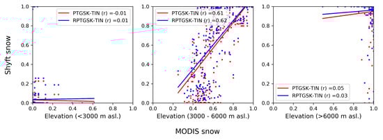 The scatterplots between the 8-day snow cover area fraction from models and MODIS in different elevations are shown in Figure 10. As can be seen from this figure, the topography seems to have a dominating effect on snow cover distribution. In the elevation ranges up to 3000 m asl, very few snow events were detected from both models and almost no snow events were detected from the MODIS. The ranges from 3000 to 6000 m asl experience greater snow coverage, whose spatial distribution is relatively better captured by both data sets. A slightly higher correlation coefficient between MODIS and RPTGSK-TIN simulation was observed as compared to PTGSK-TIN (Figure 10). During the snow ablation period, the high mountain ranges (>6000 m asl) have permanent glaciers which are not simulated by Gamma snow but detected in MODIS giving lower correlation coefficients for both models.