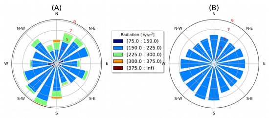 Distribution of daily average (2005) WFDEI radiation with respect to aspect (A) Interpolated translate radiation; (B) Interpolated radiation radiation.