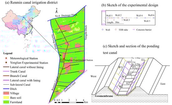 Field experiments were carried out at the Yonglian Experimental Station, which is located in the Renmin branch canal irrigation district (41°0′52.17″ N–41°8′4.98″ N, 107°59′8.62″ E–108°1′48.79″ E and altitude of 1028 m above sea level). The Renmin branch canal irrigation district is a part of the HID, as shown in Figure 1a. The climate in the area is arid continental, with average annual precipitation from 130 mm to 215 mm and average annual evaporation from water surface from 2100 mm to 2300 mm [53]. The freezing and thawing period lasts from late November to the middle of May, during which the maximum frozen depth is 1.0–1.2 m. The Renmin branch canal irrigation district is 12 km long from north to south and 3 km wide from east to west, with 29.75 km2 of farmland. The ground surface elevation decreases from 1028.9 m to 1025.4 m from southwest to northeast. The irrigation water is derived from the Yellow River by the Zaohuo trunk canal, delivered to the Renmin branch canal, and then distributed by its 25 lateral canals and 346 sub-lateral canals to fields. In April 2018, a field survey was conducted to determine the lining materials of each lateral and sub-lateral canal in the Renmin branch canal irrigation district. The locations and lining conditions of the lateral canals are shown in Figure 1a. The canal section of the Renmin canal, most of the lateral canals, and sub-lateral canals are trapezoidal. The main lining materials are concrete and geomembrane. The Renmin branch is approximately 12 km, which was lined with concrete and geomembrane in 2014–2016. The laterals were lined with the concrete from 2000 to 2015. The total length of lateral canals with linings is approximately 21.11 km, which accounts for 74% of the total length in the Renmin branch-controlled area. For sub-lateral canals, only the test canal was lined with concrete and geomembrane composite lining in 2015, and others are all unlined. The transformation of canals in the canal lining has been conducted in the study area to increase the water use efficiency.