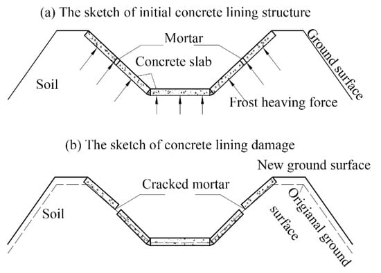 - Mo, T.; Lou, Z. Numerical Simulation of Frost Heave of Concrete Lining Trapezoidal Channel under an Open System. Water 2020, 12, 335. [Google Scholar] [CrossRef]