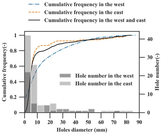 There were 42 and 83 holes observed in the geomembranes of the west and east banks, respectively. The number and cumulative frequency of holes with different diameters on the geomembrane located on the west and east sides of the canal are shown in Figure 3.