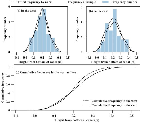 The holes with diameters smaller than or equal to 10 mm accounted for more than 78%, the numbers of which on the left and right sides of the canal accounted for 86% and 64%, respectively. These holes were mainly caused by weed roots. In addition, 15 holes with diameters larger than 25 mm accounted for 12%, which was caused by the wooden wedge used to keep the geomembrane in place when it was installed. The distribution of hole numbers in the west and east banks at different heights is shown in Figure 4a,b. The distribution was fitted by the normal distribution, which is basically consistent with the statistical value distribution. The cumulative frequency of holes located at different vertical positions from the bottom of the canal on the geomembrane is shown in Figure 4c.