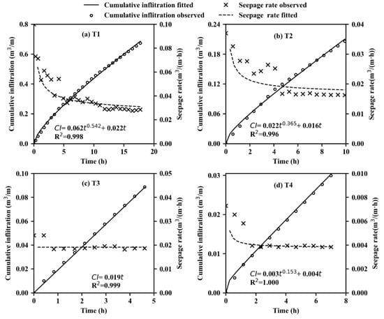 The cumulative infiltration and its fitting equation by the modified Kostiakov model (see Equation (11)) during the stable water level stage during the four treatments are shown in Figure 5.