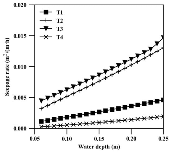 Obvious differences can be found in the infiltration time and cumulative infiltration at the end of the stable water level stage. It was approximately 17.74 h before the T1 treatment became stable, while it was 9.90, 4.61, and 7.00 h for the T2, T3, and T4 treatments, respectively; the corresponding maximum cumulative infiltration water was 0.673, 0.205, 0.088, and 0.300 m3/m, respectively, which may be caused by the difference in the initial soil moisture. The drier soil has a larger infiltration capacity [16,63]. As a result, the T1 treatment had the largest maximum cumulative infiltration due to having the smallest soil moisture. The seepage rate was relatively large initially and gradually decreased to its stable seepage rate, as shown in Figure 5. This is a common infiltration process due to the increasing dominance of gravity-driven flow over capillarity-driven flow with increased penetration depth [16,64]. The steady seepage rates (ic) in the T1, T2, T3, and T4 treatments were 0.022, 0.016, 0.019, and 0.004 m3/(h·m), respectively. It can be found that ic in T4 was the minimum in terms of the best seepage control effect, which shows that canal seepage was obviously reduced by the newly installed composite lining. The canal water depths of the T2 treatment and T3 treatment were similar (see Table 1), but the ic in the T2 treatment was 16% smaller than that in the T3 treatment, which suggested that the geomembrane with three years of service time had little seepage control effect. The ic of T1 is more than T2, which is due to the higher water depth (0.4 m) as shown in the Table 1, and the incomplete geomembrane lining that the canal section above 0.25 m height from canal bottom were not totally covered by geomembrane lining for the reason of construction.